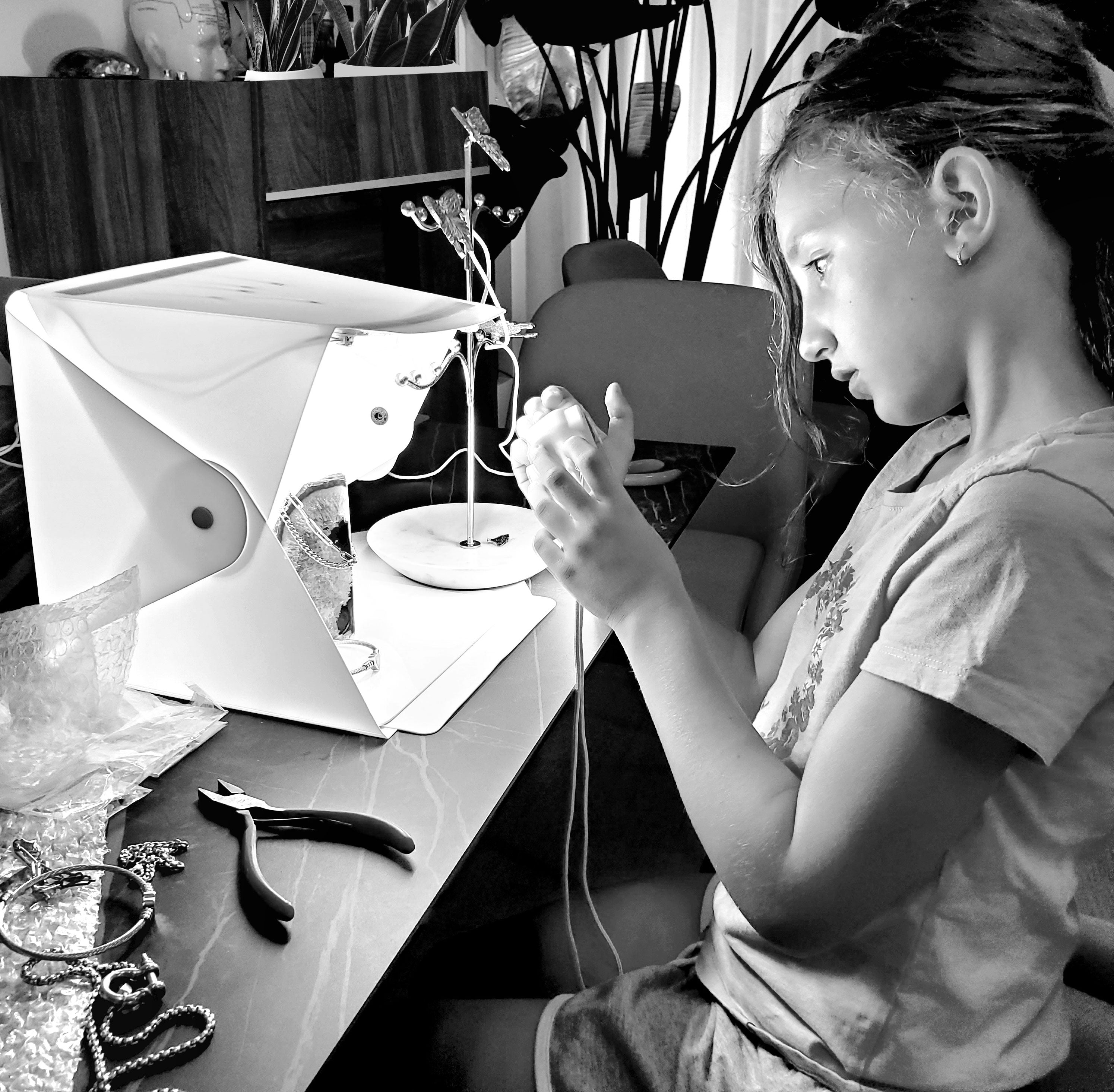 Qu'il s'agisse de photographie de produits, de création de designs ou d'organisation d'inventaire, Sofia est pratique malgré son jeune âge et toujours curieuse d'en savoir plus sur la création d'une marque de bijoux.